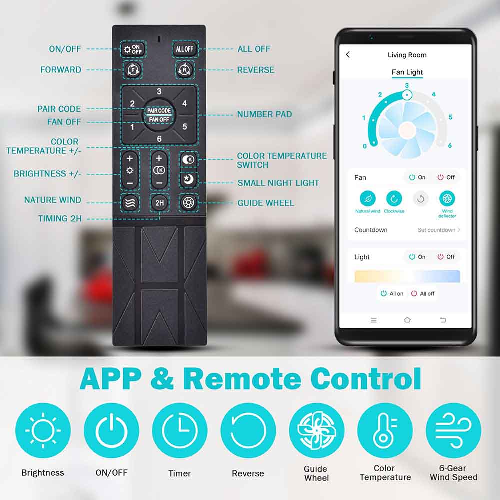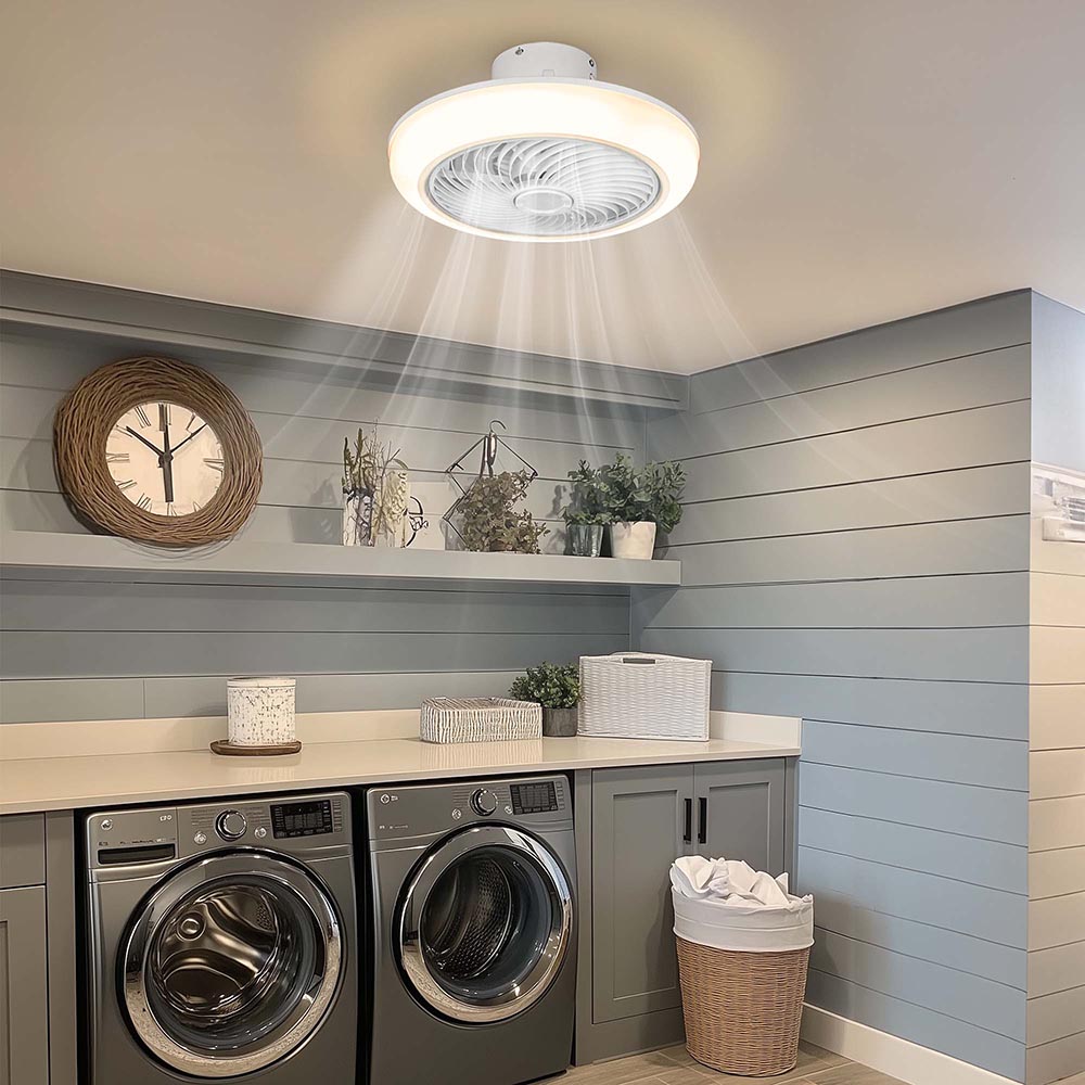 Enclosed Ceiling Fan with LED Light delivers powerful air movement with 6-gear wind speeds and enables stepless dimming via Bluetooth APP control and remote control, making a comfortable environment for living rooms, bedrooms, laundry rooms, dining rooms, study rooms, kitchens, garages, basements, workshops, etc.