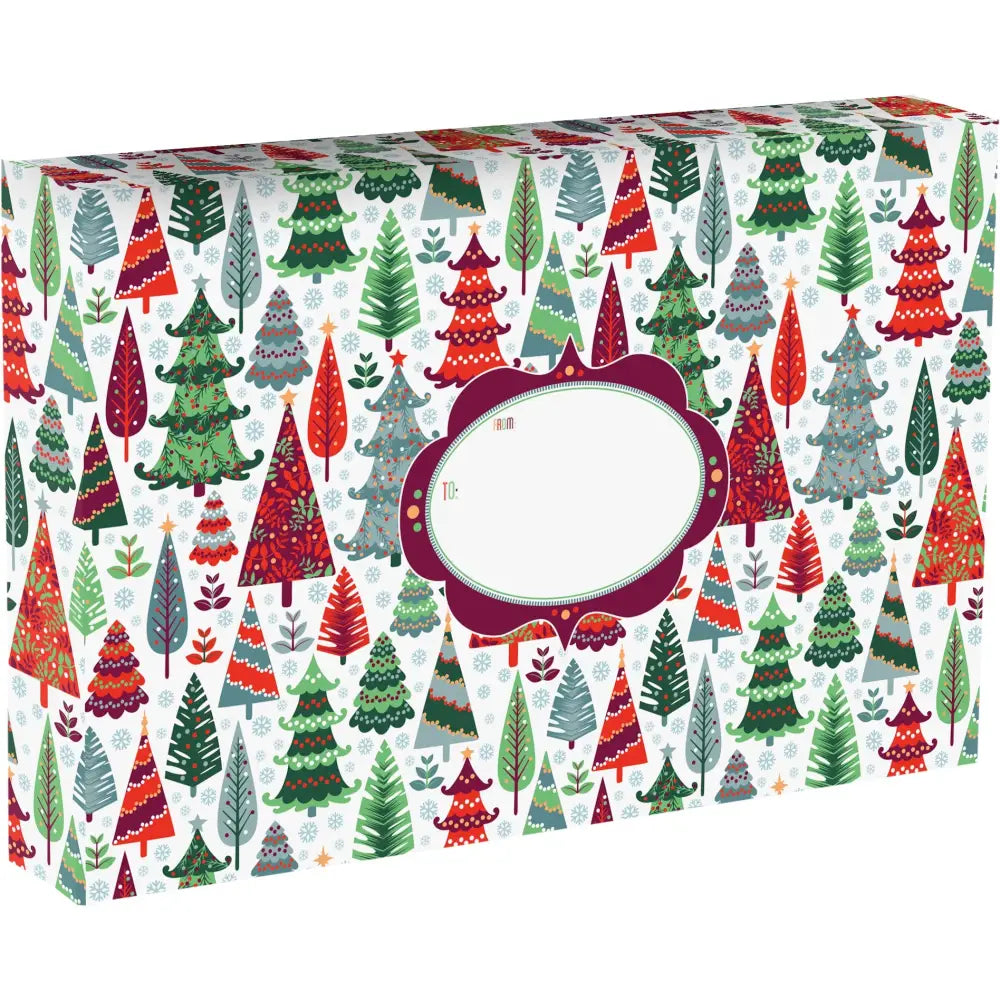 Gift Mailing Box - Holiday Trees - 18" x 12" x 3" - (42 Count) - High Gloss Finish - Tamper proof locking tab located on the sides of the boxes / Meets all major carrier shipping standards / 80-90% Post consumer recycled paper - No chlorine or bleach - Inks are non-toxic